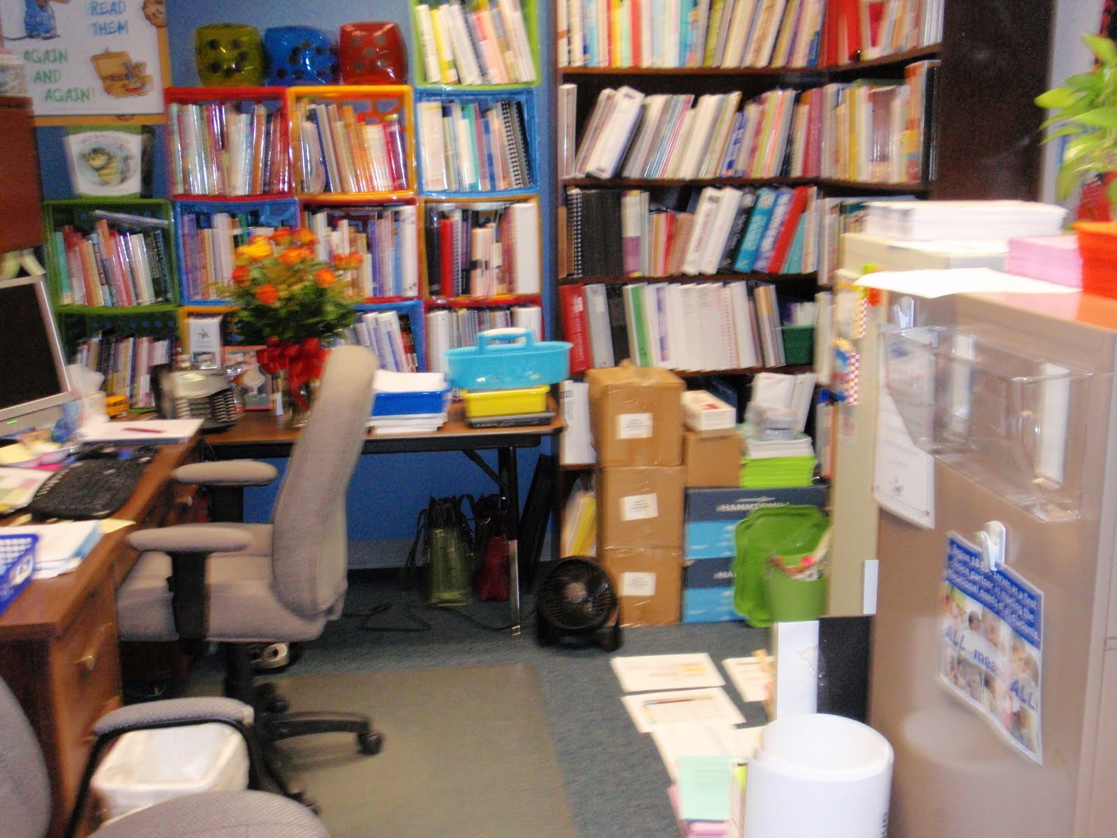 I’m in the new office. I like my new desk. I’m still deciding where to put things because there are lots of new cubby holes. But there’s a lot of change from my old desk too. The drawers aren’t in the same places. They aren’t the same size. I’m adjusting well. I’m in the office, just not completely put away. I think I’ve found a new friend in my desk. It’s comforting to be behind my shelves at my desk.